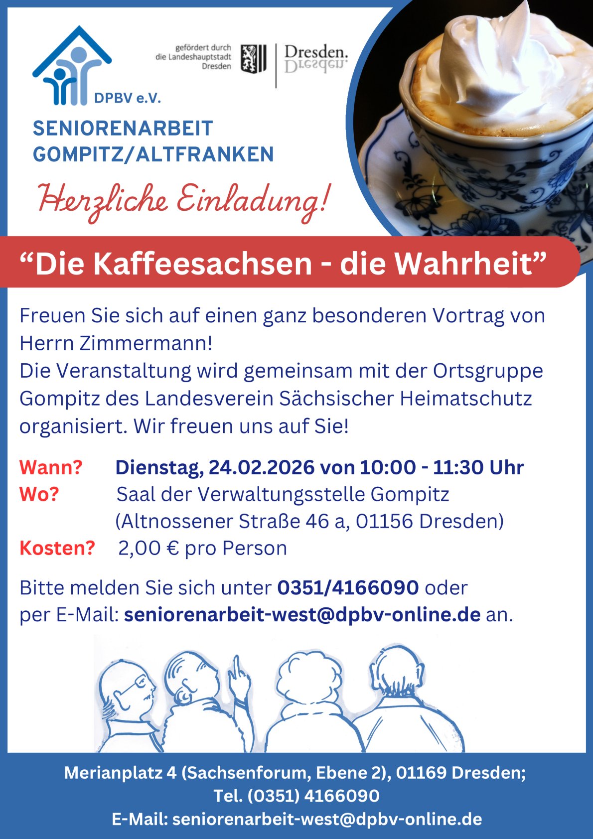 Wir möchten gern einen Punkt ansprechen, der uns sehr am Herzen liegt! Unsere Begegnungsangebote werden zu 90% von der Landeshauptstadt Dresden finanziert. Das heißt, 10% fehlen und wir müssen diesen Betrag erwirtschaften, damit wir auch in Zukunft für Sie da sein können.